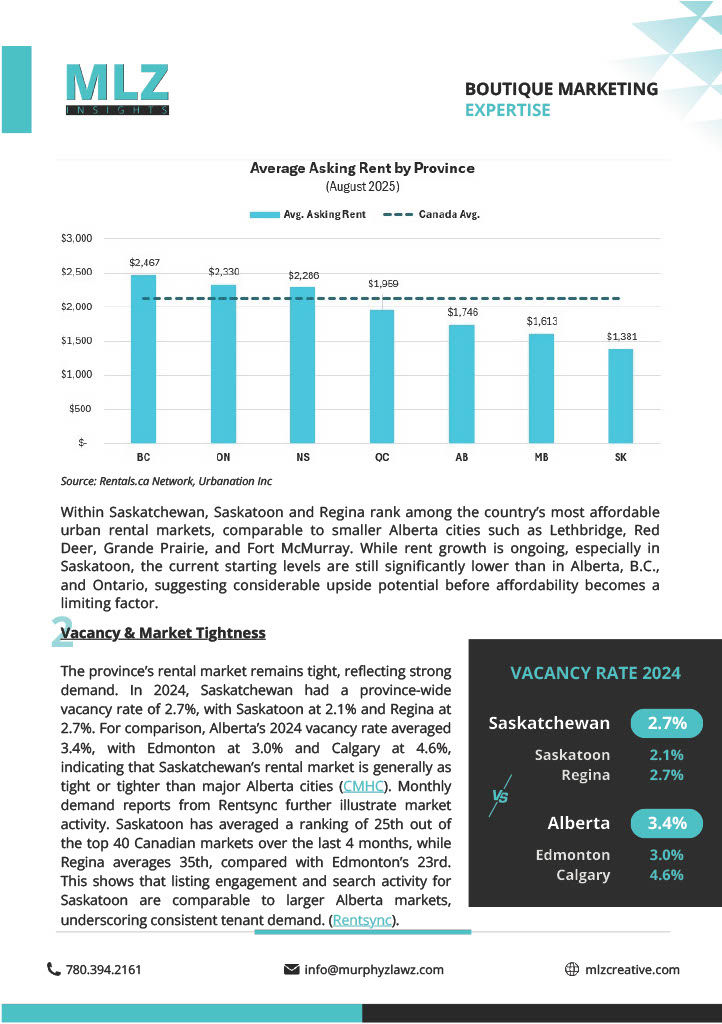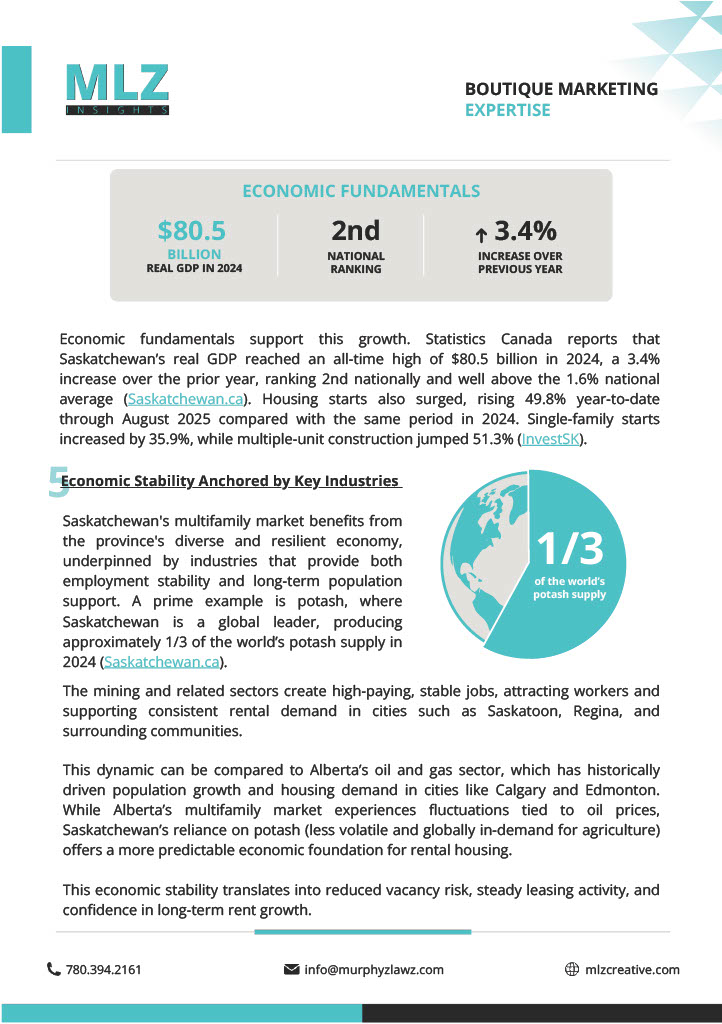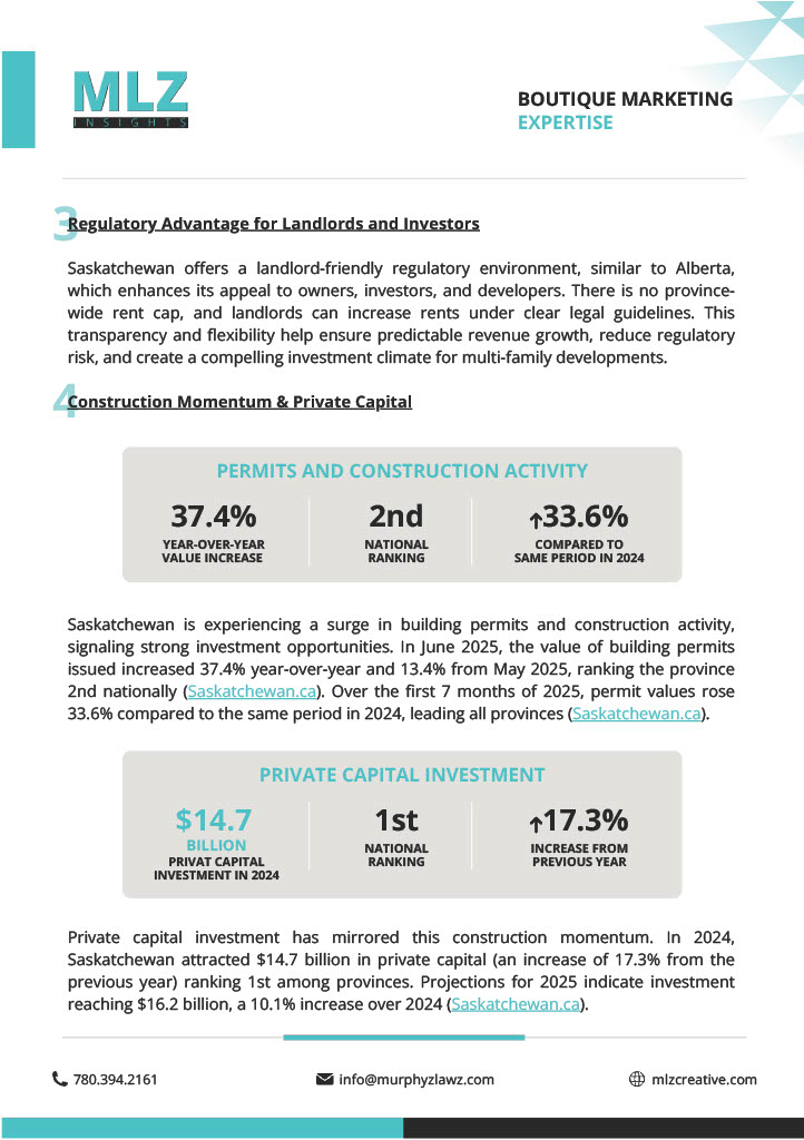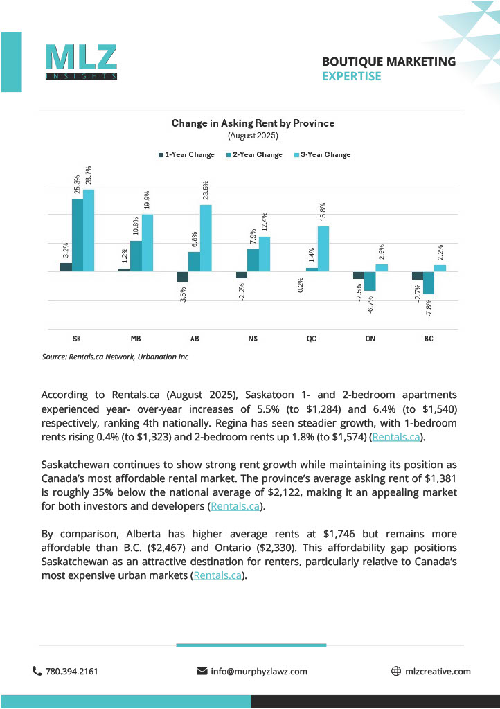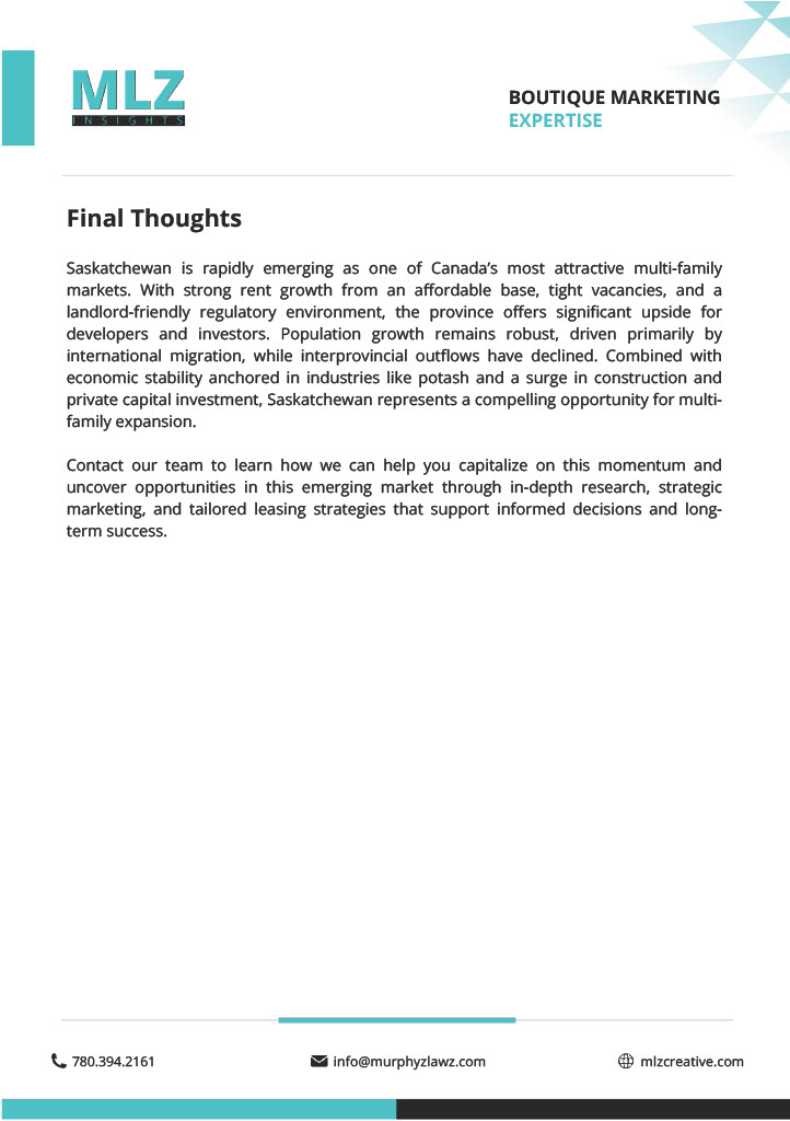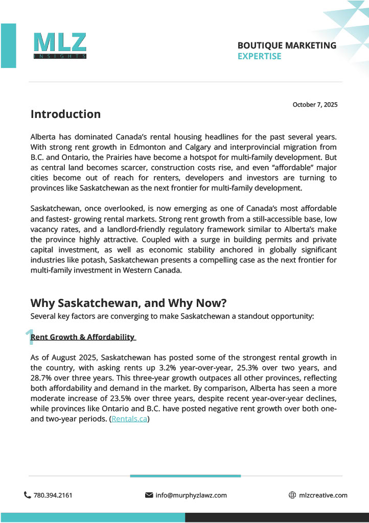Saskatchewan is rapidly emerging as one of Canada’s most attractive multi-family markets. With strong rent growth from an affordable base, tight vacancies, and a landlord-friendly regulatory environment, the province offers significant upside for developers and investors. Check out this research report done by MLZ creative for more information on how Saskatchewan is growing in the multi-family market!